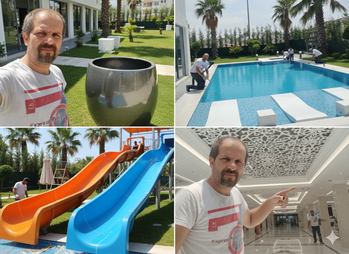 Antalya’nın turizm ve sanayi dünyasında, fiberglass ve polyester çözümlerinde liderliği temsil eden Antpol, profesyonel işçiliği ve yenilikçi üretim anlayışıyla hizmetinizdedir. Tesisinizin tüm bakım, onarım ve dekorasyon süreçlerini tek bir çatı altında, Express Fiberglass güvencesiyle yönetiyoruz.